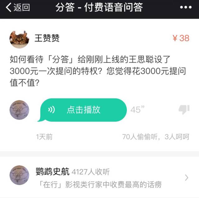 前段时间由果壳在行推出的“分答”大概也刷爆了一些人的朋友圈,模式是蛮有趣的模式,自己定价问题,然后别人付费向你提问,语音回答以后可以收到钱,而其他人可以花1块钱偷偷听你的答案,你和提问者各分得五毛。据说王思聪已经凭借分答赚到了十七万以上的“零花钱”。看看知友们是如何看待这样的模式的: