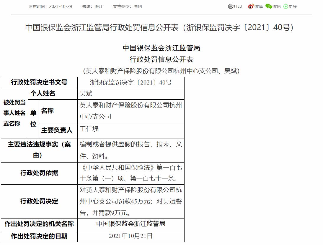 据中国银保监会10月29日通报,英大泰和财产保险股份有限公司杭州中心支公司因编制或者提供虚假的报告、报表、文件、资料,被浙江监管局罚款45万元。