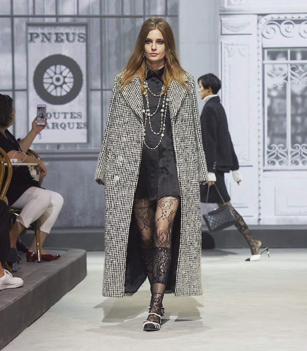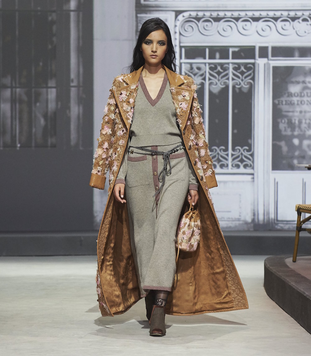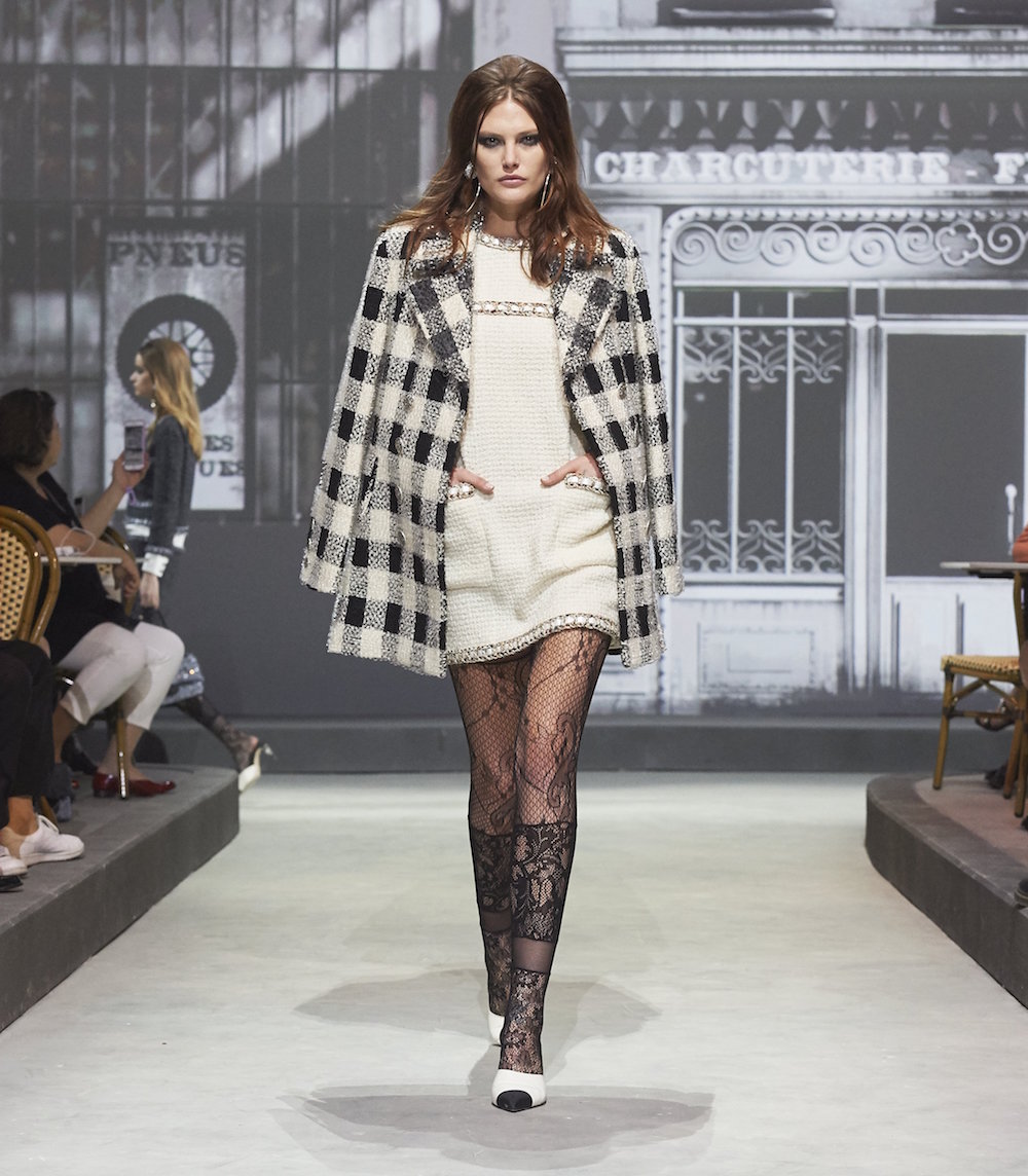 “巴黎在罗马”高级手工坊系列,以罗马深秋的色调和Chanel经典的米色、奶油色、灰色、黑色和海军蓝为主。运用斜纹软呢、马海毛、圈圈羊毛、羊绒、皮革、弹性针织、天鹅绒、蕾丝、真丝绉绸以及乔其纱等多种面料和材质;而蕾丝长筒袜搭配高跟鞋,为整体造型赋予了意大利风情。