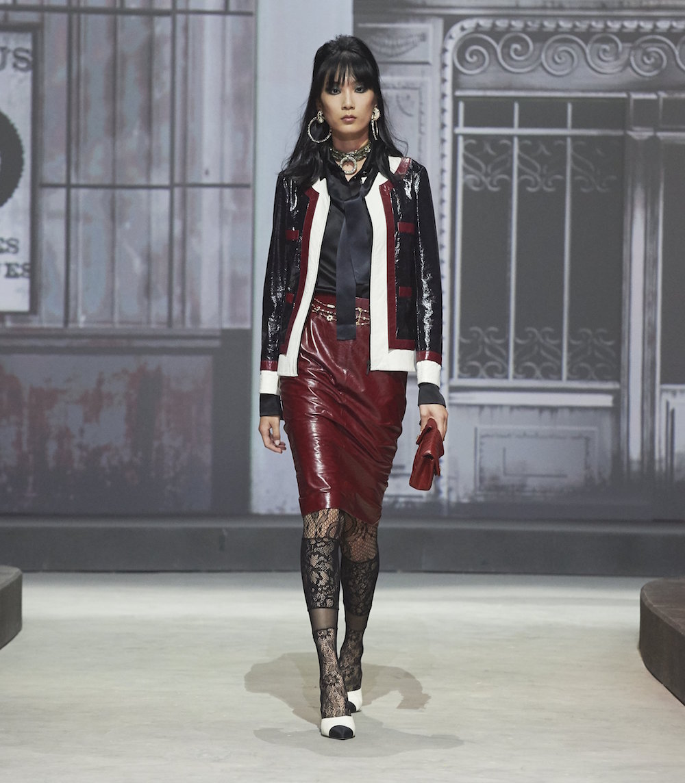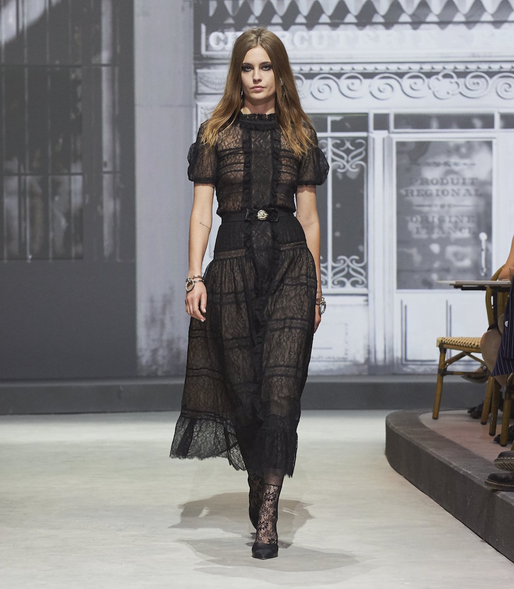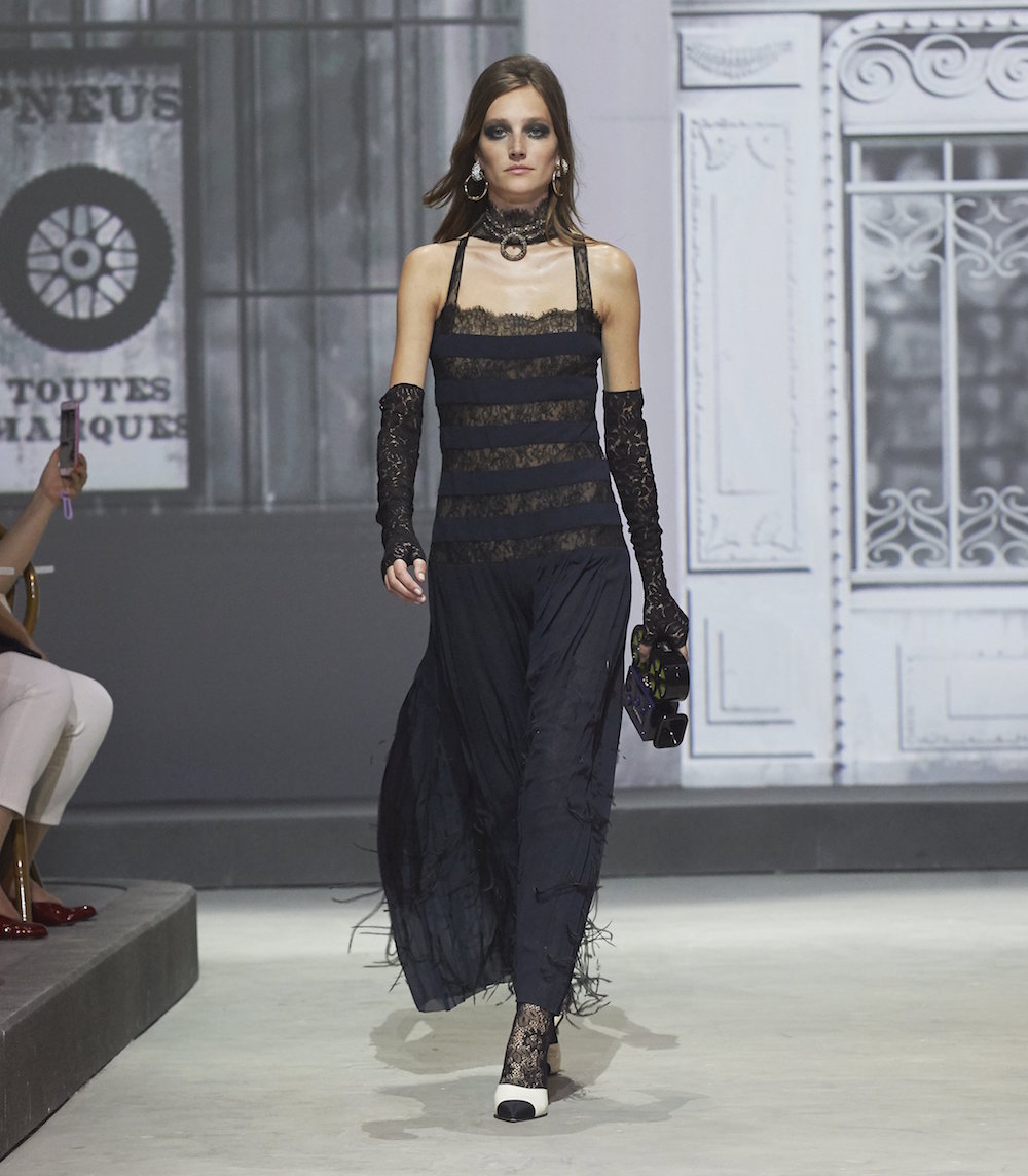 “巴黎在罗马”高级手工坊系列,以罗马深秋的色调和Chanel经典的米色、奶油色、灰色、黑色和海军蓝为主。运用斜纹软呢、马海毛、圈圈羊毛、羊绒、皮革、弹性针织、天鹅绒、蕾丝、真丝绉绸以及乔其纱等多种面料和材质;而蕾丝长筒袜搭配高跟鞋,为整体造型赋予了意大利风情。