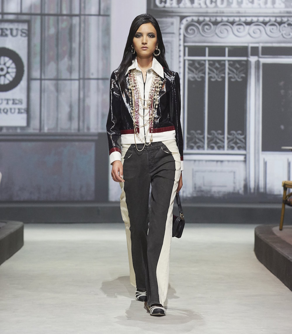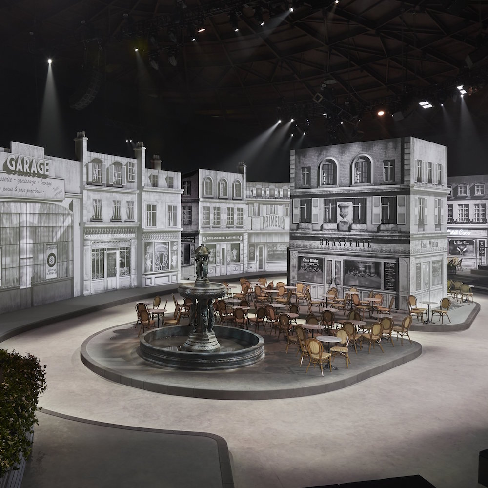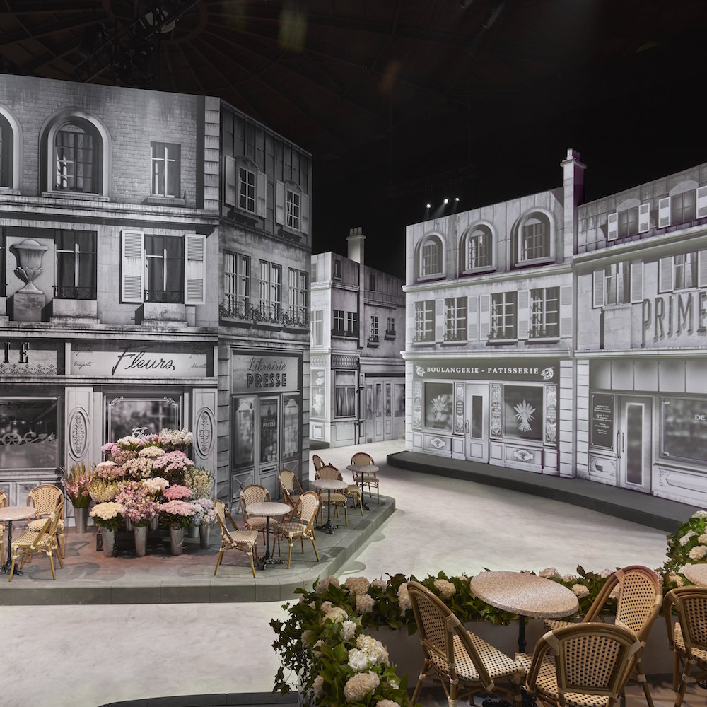 为了复刻5号摄影棚,秀场场景的搭建前后大约花费了两周时间。呈现的是巴黎一个最普通的街区修车店、花店、甜点铺、面包房、咖啡店和小酒馆,“户外空间”里,放置着巴黎街头最常见的藤椅和小餐桌。没什么标志性地标,但一眼就能辨认出属于哪一个城市。