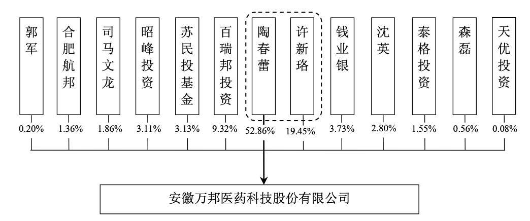 截至招股书签署日,公司的控股股东为陶春蕾,实际控制人为陶春蕾、许新珞。陶春蕾、许新珞系母子关系, 二人合计直接持有公司72.31%的股份,此外,陶春蕾通过百瑞邦投资、合肥航邦(两者皆为员工持股平台)控制公司10.68%的股份。