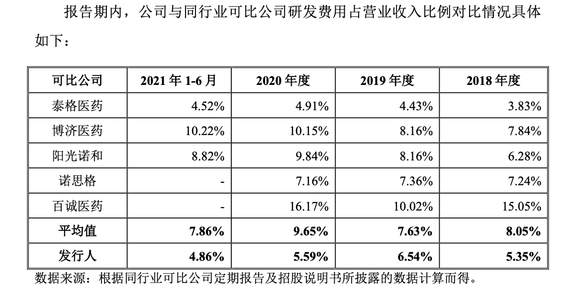 2018年-2021年上半年(报告期内)万邦药业的营收增速较慢,但毛利率高于行业平均,净利润率快速上涨,由2018年的26.67%增至2020年39.56%。然而从研发投入来看,公司研发费用率不及同行,研发项目较少。在医药产业由仿制为主向自主创新为主的战略转变之下,倒逼国内CRO企业必须加快从承接仿制药一致性评价项目向承接创新药研发项目的转型,公司的创新药研发服务能力薄弱。