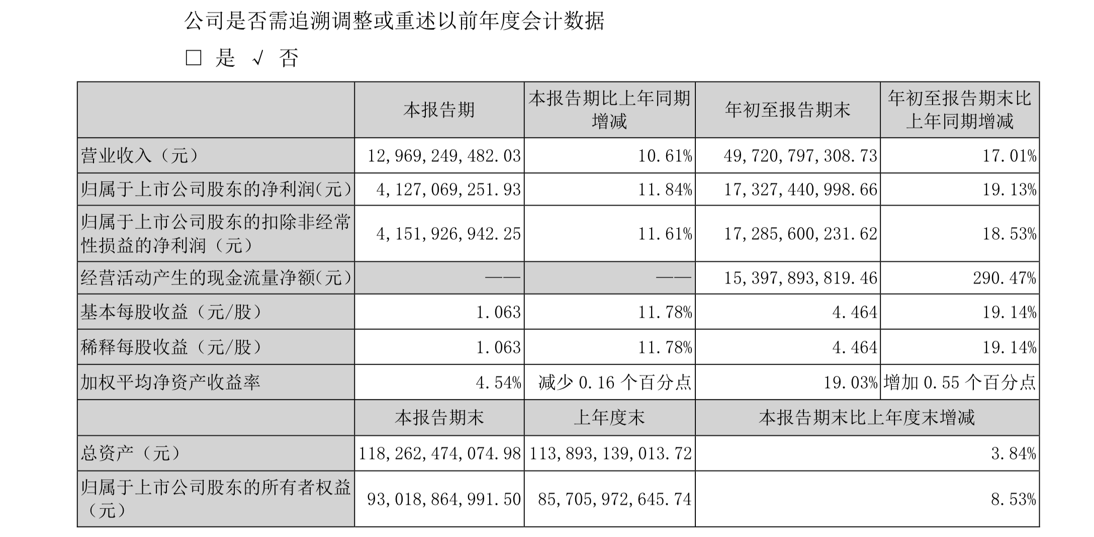 10月29日晚间,宜宾五粮液股份有限公司(以下简称“五粮液”)(SZ000858)发布2021 年第三季度报告,报告显示,2021年前三季度,实现营业收入497.21亿元,同比增长17.01%;归属上市公司股东的净利润173.27亿元,同比增长19.13%;经营活动产生的现金流量净额为153.98亿元,同比增长290.47%。