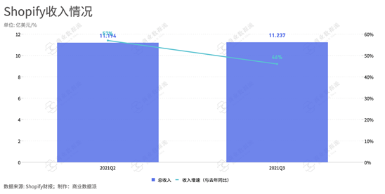 首先,一路战绩高歌的Shopify遇到了“滑铁卢”。2021年Q3,其出现了401万美元的营业亏损,相比上个季度的1.394亿美元,落差明显。此外,本季度其收入增速也开始下降。如Q3收入于去年同期相比增速为46%,相比Q2的同比增速57%,降低11个百分点。尽管,Shopify强调,“由于业务的季节性,同比的连续结果更有意义。”但是持续增速放缓已经是不争的事实。