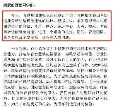 创始人周韶宁写了一封内部公开信,并称"这是一个艰难的决定"。而极兔总裁樊苏洲的发言则显得更高兴一些:“本次收购优势互补,可以优化双方在中国市场的末端网络布局。”