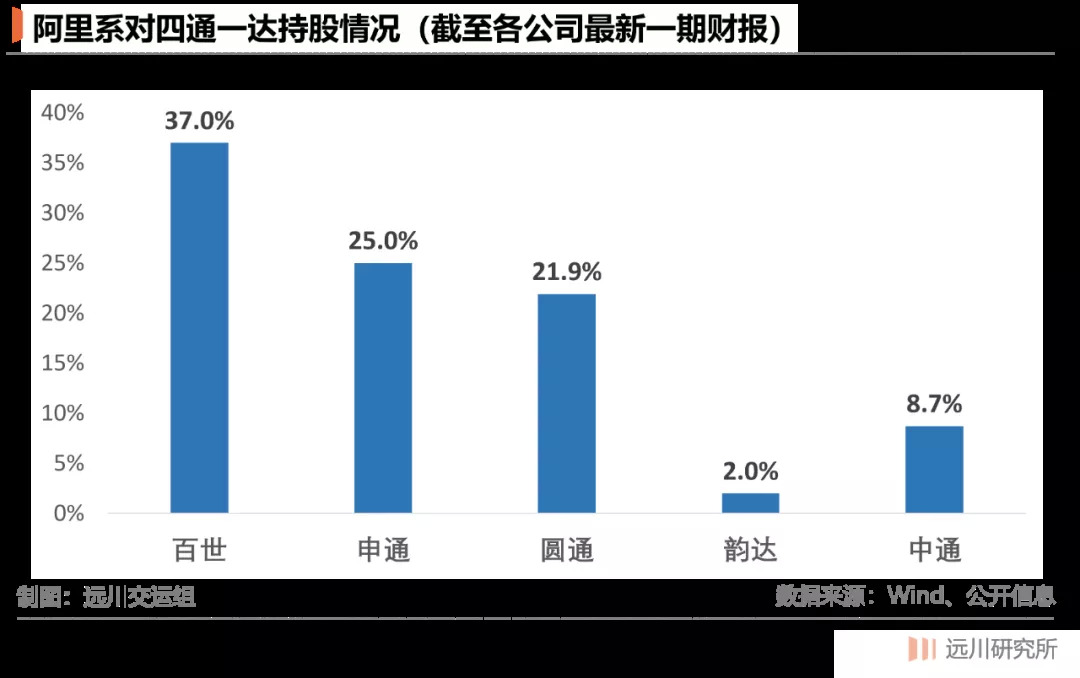 阿里系对“四通一达”均有投资,但比较尴尬的是,持股比例最高的百世和申通(阿里甚至向申通空降了高管)目前经营最困难;而持股比例最低的中通和韵达,反而逐渐胜出。