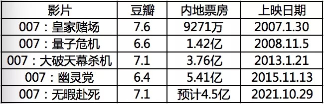 之前的太过于久远,内地票房数据没有参考价值,就拿丹叔担任007以来的几部作品来看,它在内地的市场表现相对一般,远未达到好莱坞顶级IP的水准。但就整体的品质和全球市场来看,丹叔接力之后的整体表现还是不错的,至少绝没有给整个系列丢脸。