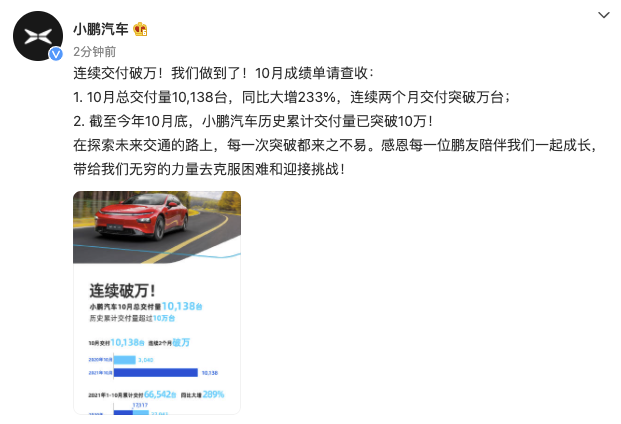 11月1日上午,@小鹏汽车 微博公布10月交付数据:10月总交付量10,138台,同比大增233%,连续两个月交付突破万台;截至今年10月底,小鹏汽车历史累计交付量已突破10万。