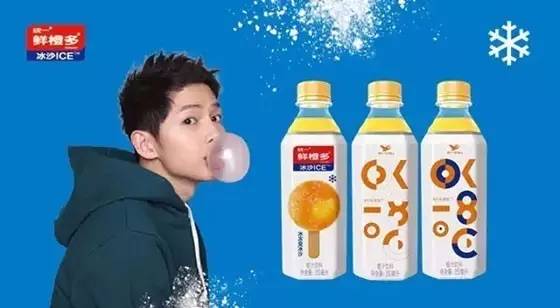 此外,鲜橙多还发布了另一款中英文混搭的产品——“冰沙ice”,是今年这批饮料小鲜肉里的高科技担当。它的神奇之处首先在于产品,冷冻以后变身冰沙;其次在包装,背面的温变油墨技术在8℃以下会产生局部的“白变蓝”效果。(如下图右一所示)