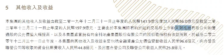 融创中国2020年业绩报显示,由于持有的贝壳股票浮盈,其金融资产公允价值收益净额由2019年的7.8亿元增至96.56亿元。由此也带动了融创中国其他收入及收益由2019年度的141.9亿元增加56亿元至2020年度的197.9亿元。