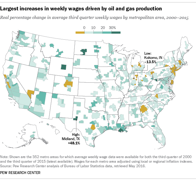 皮尤研究中心在对美国联邦薪资数据进行分析后发现,自2000年以来,工人实际平均周薪(即经过通胀调整后的薪水)增长最快的现象,大部分发生在那些直接受益于油气繁荣的都市区,如得克萨斯州的米德兰(Midland)和奥德萨(Odessa)、北达科他州的俾斯麦(Bismarck)、怀俄明州的卡斯伯(Casper),以及路易斯安那州的霍马(Houma)和莱克查尔斯(Lake Charles)。