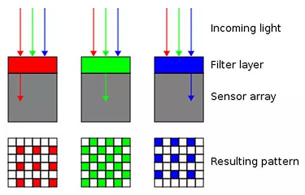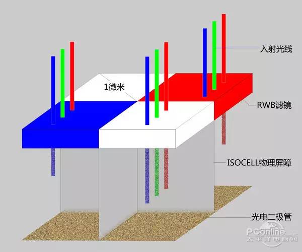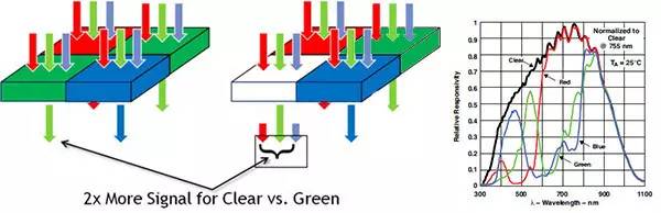 弱光环境成像的质量主要决定于传感量的进光量。尽管COMS的尺寸没办法持续放大,但上游厂商却想到了通过改变CMOS的结构而增加进光量的方法。事实上,手机感光元件上方通常会放置一块分色滤镜,通常采用RGB(1红2绿1蓝)的排列方式将灰度信息转变成彩色信息。不过,分色滤镜会过滤大部分的光线。