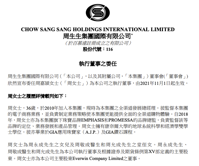 周生生11月1日午间在港交所公告,公司董事会宣布委任周嘉颖女士为本公司之执行董事,由2021年11月1日起生效。公告简历显示,周女士于2010年加入本集团,现时为本集团之全渠道发展总经理。周女士为周永成之女儿及周敬成和周允成之堂侄女。