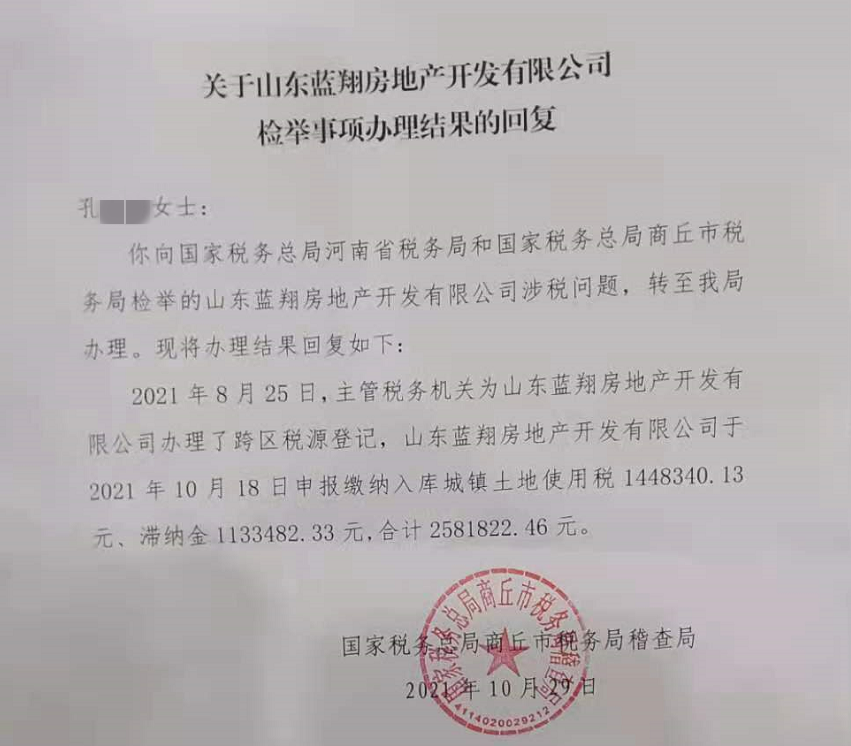 孔素英向界面新闻提供的《关于山东蓝翔房地产开发有限公司检举事项办理结果的回复》显示,2021年8月25日,主管税务机关为山东蓝翔房地产开发有限公司办理了跨区税源登记,该公司于2021年10月18日申报缴纳入库城镇土地使用税1448340.13元、滞纳金1133482.33元,合计2581822.46元。