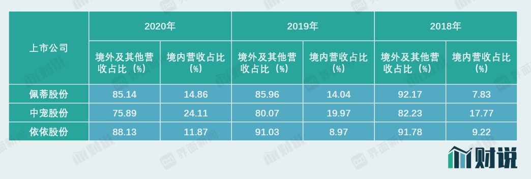 宠物上市公司业绩表现与行业发展大相径庭,背后主要原因是这些上市公司核心业务并不在国内。包括中宠股份、佩蒂股份、依依股份在内A股宠物公司普遍以外销出口为主,从财务数据看这些公司境外销售占比都在75%以上。外销产品品牌标识主要用境外客户所提供品牌,俗称贴牌销售或OEM/ODM,销售地区以美洲、欧洲、日本为主,客户主要为国际大型宠物食品零售商及经销商,包括沃尔玛、Petco 、 PetSmart、Pets at Home等。