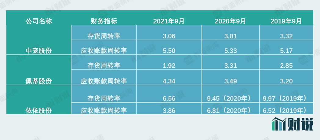与业绩下滑相伴随的是宠物上市公司运营效率下降。截至2021年9月末,中宠股份、佩蒂股份、依依股份存货占营收比例分别达到25%、46%、13%,应收账款占营收比例分别达到23%、21%、30%。近三年存货周转率、应收账款周转率指标整体处于下降趋势。