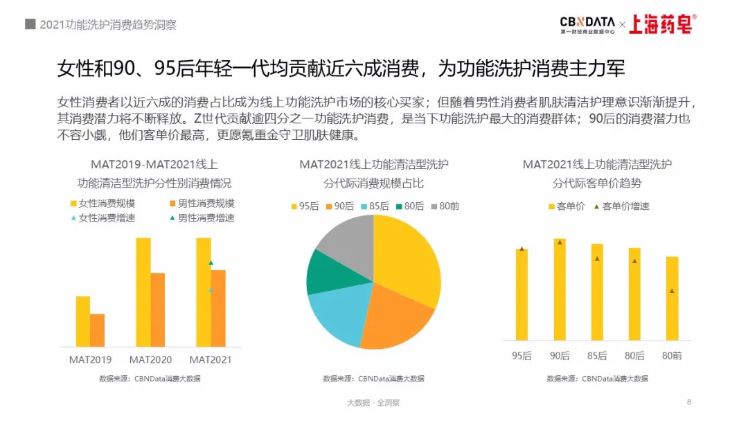 另一边,新的消费趋势也映射了消费人群的迭代。CBNData消费大数据指出,在2021线上功能清洁型洗护市场中,Z世代消费者的消费规模的占比超过了四分之一,是该品类最大的消费群体;90后消费者则凭借最高的客单价成为最具潜力的功能清洁型洗护消费人群。