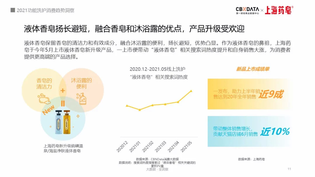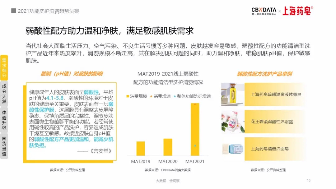 以上海药皂硫磺温泉液体香皂、花王碧柔弱酸性沐浴露、上海药皂清痘洁面皂等产品为代表的弱酸性配方功能清洁型洗护产品热度迅速攀升,消费规模也不断扩大。