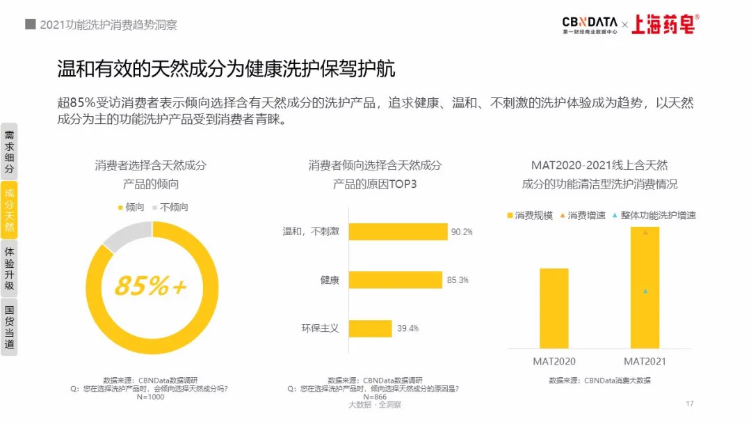 在CBNData调研的1000位消费者中,倾向于天然成分产品的消费者占比超过85%,温和不刺激、健康以及环保是天然成分产品突出的优势。