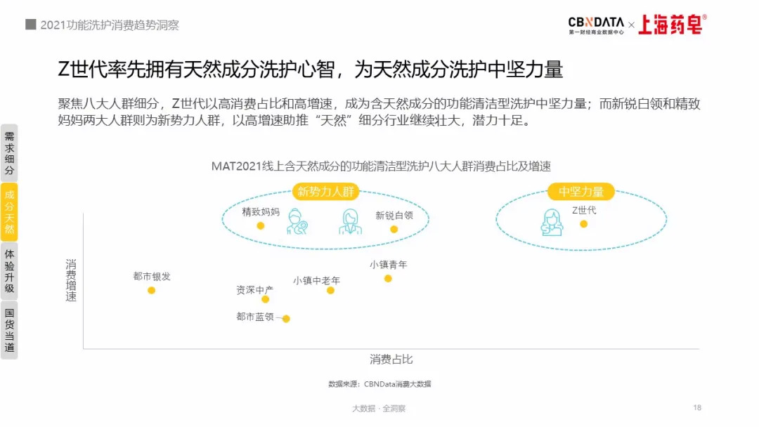 《报告》显示,在都市银发、资深中产、都市蓝领、小镇中老年、小镇青年、精致妈妈和新锐白领八大人群中,新锐白领和精致妈妈是选购“天然成分”持续壮大的主力人群,且潜力十足。而注重个性化消费的Z世代则再次凭借高消费占比和高增速,成为推广天然成分的中坚力量。