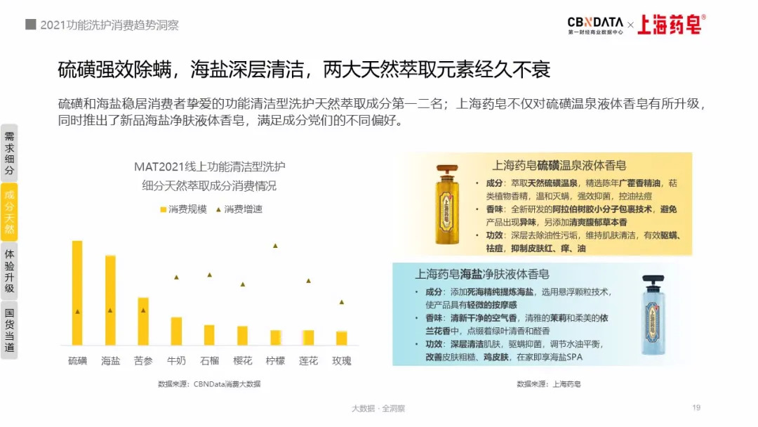 与此同时,CBNData消费大数据还显示,聚焦细分类目,硫磺和海盐是消费者最钟爱的两种功能清洁型洗护天然成分。上海药皂根据对消费者偏好的洞察,推出了硫磺温泉液体香皂和海盐净肤液体香皂。前者萃取天然硫磺泉水,能够去除油性污垢,驱螨、祛痘,抑制皮肤红、痒,油等问题;后者添加了死海精纯提炼海盐,能够深层清洁皮肤,改善皮肤粗糙、鸡皮肤等问题。