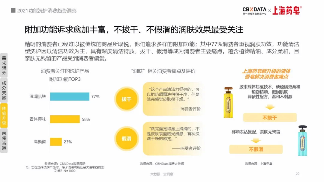 不过,即便是以清洁功效为主的功能清洁型洗护产品,也难免存在拔干(产品试用后皮肤干燥)、假滑等痛点。CBNData数据调研结果显示,在传统清洁功能外,消费者也同样对于滋润肌肤、香体抑味、高颜值等附加功能有着较高需求。