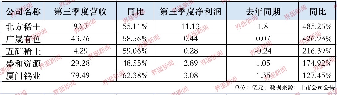 五矿稀土(000831.SZ)、盛和资源(600392.SH)和厦门钨业(600549.SH)的三季度净利润增幅也均在一倍以上,同比分别增长216.39%、174.92%和127.45%。