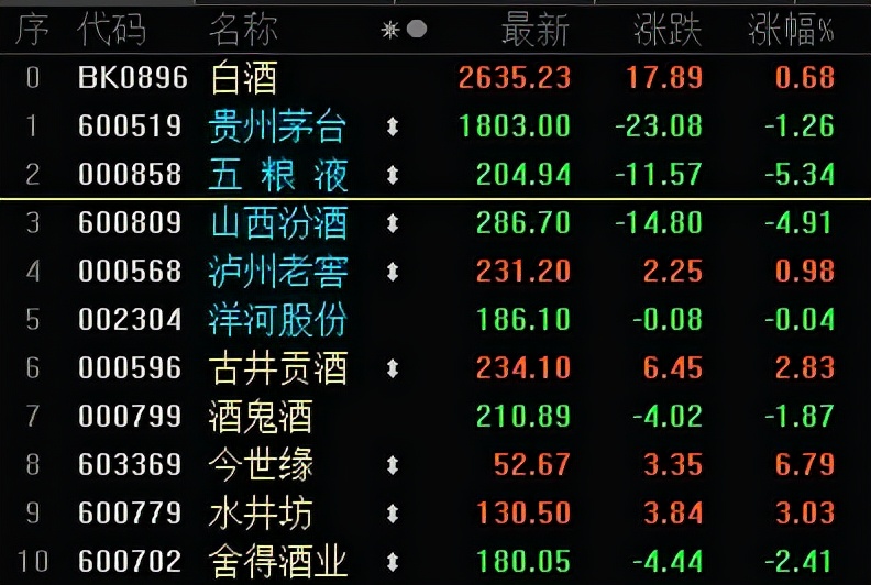 11月1日开盘后,五粮液跳空低开,开盘大跌7.63%,盘中最大跌幅接近9%。截至当日收盘,五粮液股价下跌5.34%,在整个A股白酒板块跌幅榜中位居第一。