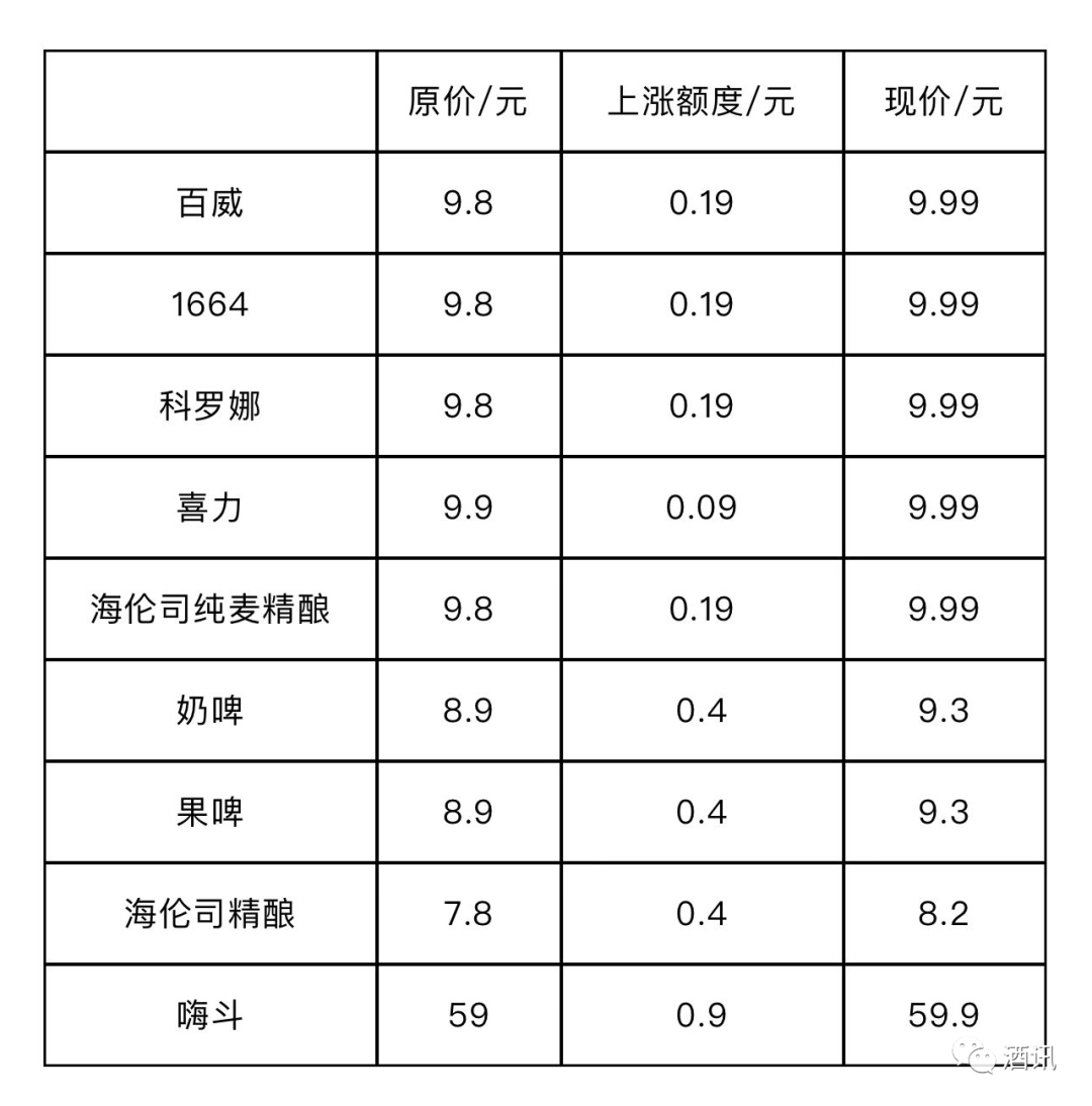 酒讯从致歉信中了解到,此次参与涨价的产品包括百威、1664、科罗娜等9款啤酒,其中5款为海伦四自有品牌。涨价幅度从0.09元-0.9元不等。涨幅最大的是嗨斗,上涨0.9元;涨幅最低的是喜力,上涨0.09元。