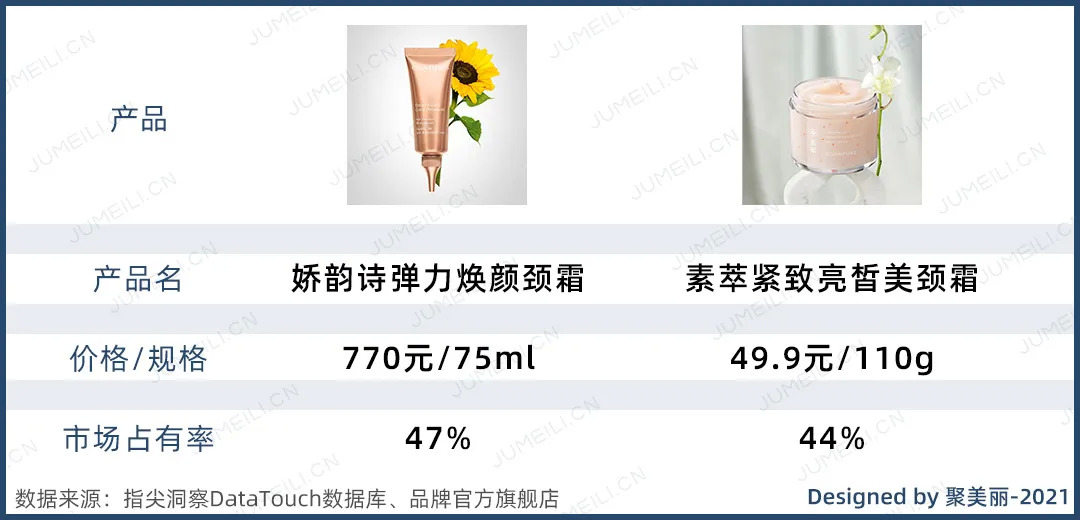 从市场整体来看,许多的化妆品品牌都入局了颈部护理赛道,但主要的市场份额被少数几个品牌占据。指尖洞察DataTouch数据库显示,在颈部护理市场,法国娇韵诗的产品销量占到市场总量的47%,排名第一;国货品牌素萃占比44%,排名第二,两者的市场份额都占比很高,差距较小。然而在价格上,娇韵诗焕颜弹力颈霜的价格为770元/75ml,素萃紧致亮皙美颈霜价格为49.9元/110g,差距较大。