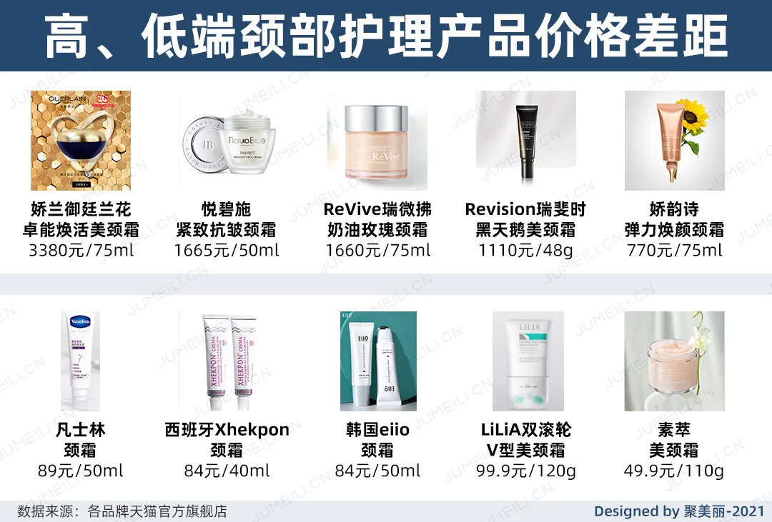 从市场端可以看到,在高端和低端颈部护理产品之间存在一个非常大的价格断档。记者不完全统计了一些产品的价格,如下图所示。
