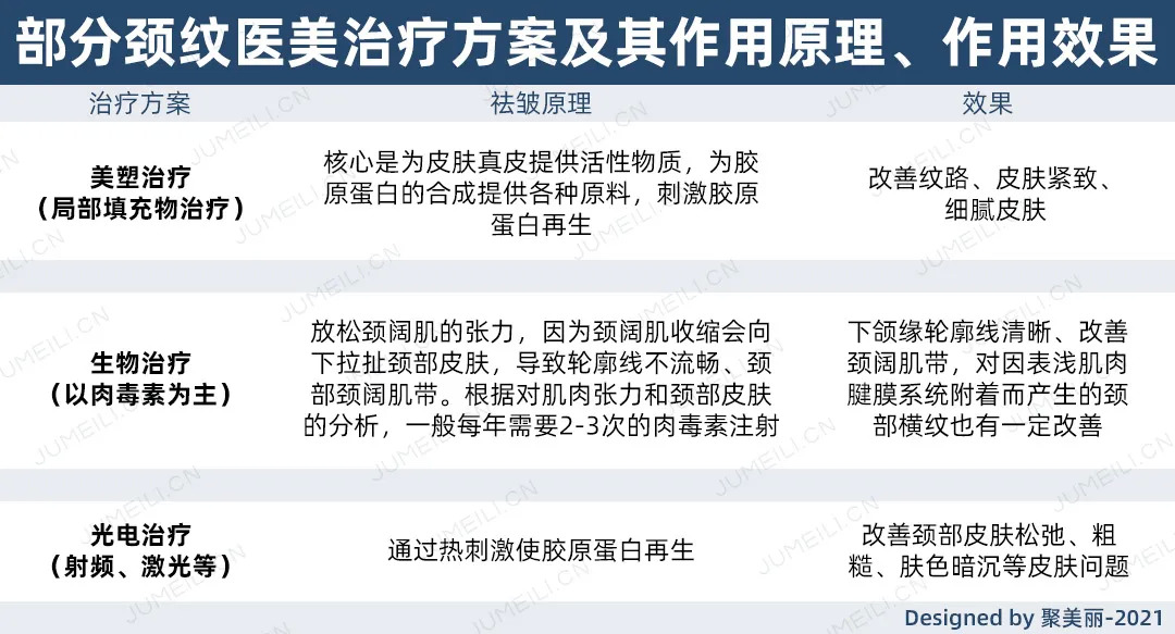 前三类方案在医美治疗中使用较多,虽然都以改善颈纹为目的,但其在作用原理和效果上存在一定的区别。对此,记者采访了安加医疗美容联合创始人田艳丽,并对采访内容进行了总结: