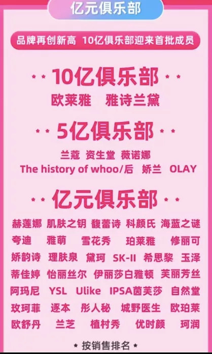 在天猫,10亿俱乐部迎来首批成员,欧莱雅1小时45分破10亿超去年全天;雅诗兰黛天猫旗舰店成高端美妆首个破10亿预售品牌。