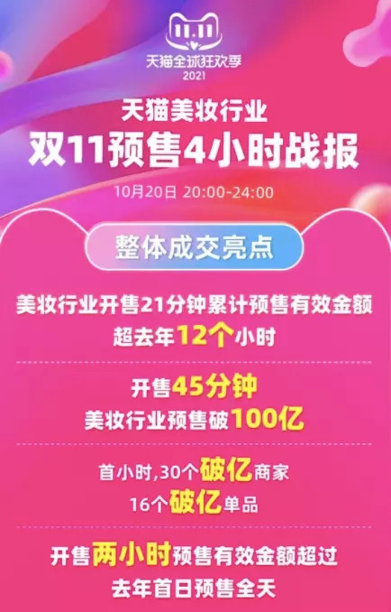 随着10月21日晚“2021天猫双11全球狂欢季”正式开启,美妆行业开售21分钟累计预售有效金额,超去年12个小时,开售45分钟美妆行业预售破100亿首小时,30个破亿商家,16个破亿单品。