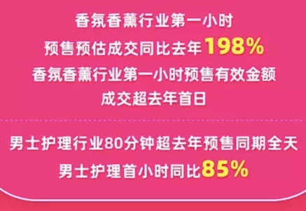 天猫开售两小时预售有效金额超过去年首日预售全天。预售4小时,2个10亿级店铺,43个破亿商家30个破亿单品。