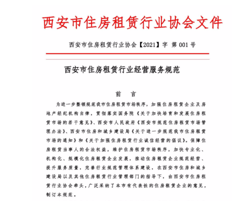 为进一步整顿规范我市住房租赁市场秩序,加强住房租赁企业及房地产经纪机构自律,保障住房租赁当事人的合法权益,维护住房租赁市场秩序,加快专业化、机构化、规模化住房租赁企业发展,推动住房租赁企业规范经营、提升服务质量,完善行业规范管理体系建设,在西安市住房和城乡建设局以及其他住房租赁行业管理部门的指导下,西安市住房租赁行业协会制定了《西安市住房租赁行业经营服务规范》并于2021年10月17日完成了在全国团体标准信息平台的公示。
