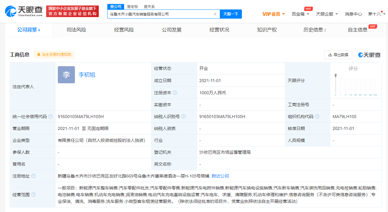据天眼查App显示,11月1日,乌鲁木齐小鹏汽车销售服务有限公司成立,法定代表人为李初旭,注册资本1000万人民币,经营范围包括新能源汽车整车销售;新能源汽车换电设施销售;充电桩销售;电池销售等。股东信息显示,该公司由小鹏汽车销售有限公司全资控股。