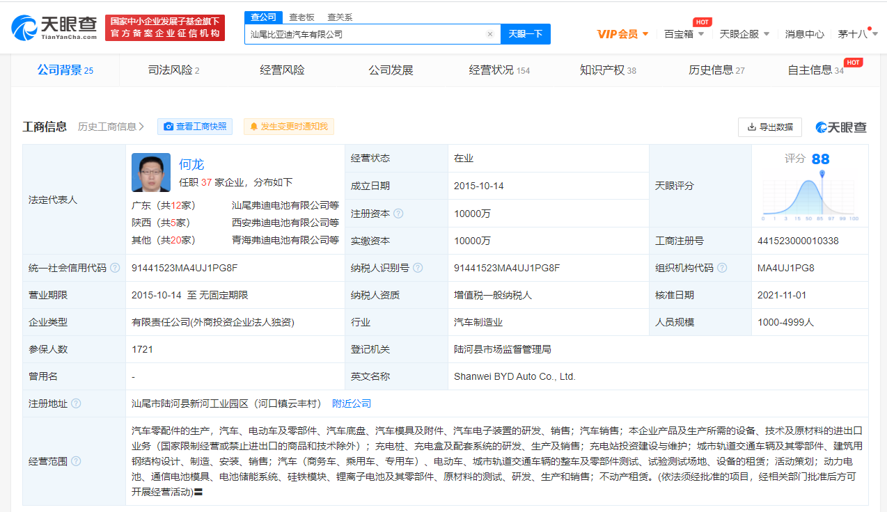 据天眼查App显示,11月1日,汕尾比亚迪汽车有限公司发生工商变更,王传福退出该公司法定代表人及董事长职务,由何龙接任。汕尾比亚迪汽车有限公司成立于2015年10月,注册资本1亿元。股东信息显示,该公司由比亚迪汽车工业有限公司全资控股。