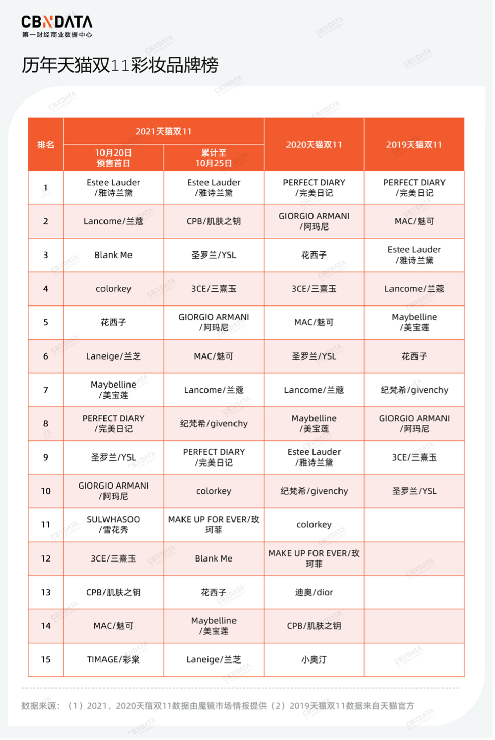 随着双十一预售激战的结束,品牌们的较量已然进入了稳定状态。从CBNData发布的历年天猫双11彩妆品牌榜中可以看出,被誉为美妆界“国货之光”的完美日记相比较前两年的战绩似乎有些掉队了。