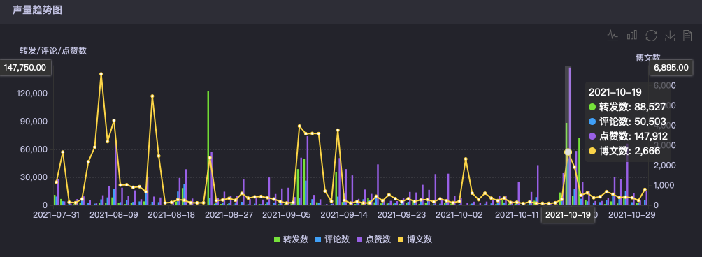牵手刘昊然的完美日记能否继续实现品牌升级,目前还并不好说。但在代言人官宣之后,完美日记确实获得了不少大众声量和热度的讨论。根据时趣极速洞察引擎对完美日记的数据分析,可以发现完美日记在官宣的声音中的社交热度呈现攀升峰值。