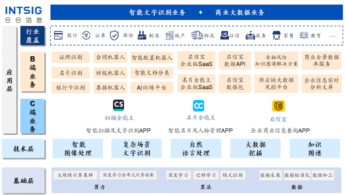 合合信息C端业务主要为面向全球个人用户的APP产品,包括扫描全能王(智能扫描及文字识别APP)、名片全能王(智能名片及人脉管理APP)、启信宝(企业商业信息查询APP)3款核心产品,B端业务为面向企业客户提供以智能文字识别、商业大数据为核心的服务。