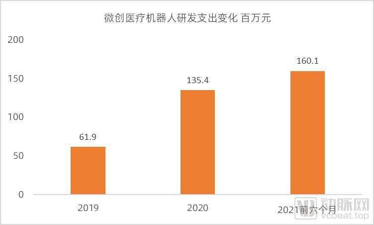产品临床推进和对外买买买让微创医疗机器人的研发支出也水涨船高。2021年前六个月的研发支出达1.6亿元,超过了2020年全年的研发投入。同时,微创医疗机器人的亏损也逐步扩大。 2019年、2020年和2021年前六个月的亏损分别为6980万元、2.09亿元和2.42亿元。