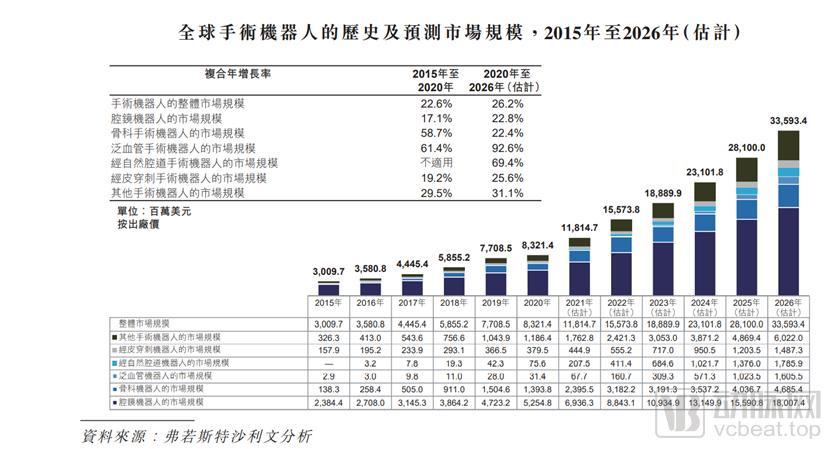 根据招股书里的弗若斯特沙利文的数据,全球手术机器人市场按照市场规模排序,可以分为五大市场:腹腔镜手术机器人市场、骨科机器人、泛血管机器人、经皮穿刺机器人、其他手术机器人市场。