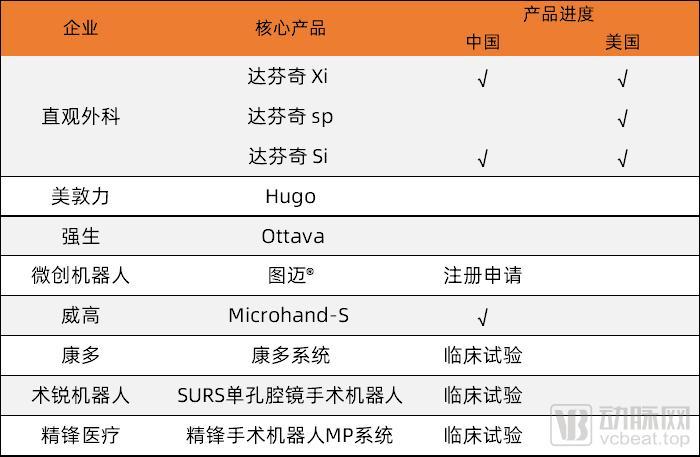 第一梯队是巨头,包括美敦力、强生都在布局腹腔镜手术机器人。美敦力的Hugo手术机器人和强生的Ottava被看作是直观外科达芬奇手术机器人的有力竞争者。