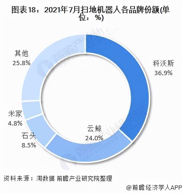 以云鲸为例,这家2016年成立的清洁机器人公司,2019年推出首款全自动扫拖一体机器人云鲸J1,在J1的基础上又推出了J2,目前只有这两款产品。但是J1凭借“自动换水+自动添加清洁液+自动洗拖布+自动热烘干拖布+定时功能”的一体化功能,上市后便成为爆款,公司销售额迅猛增长。淘数据显示,2021年7月,云鲸扫地机器人销售额同比增长4189%,市占率为24%,虽然低于科沃斯的36.9%,但远高于石头科技的8.5%。