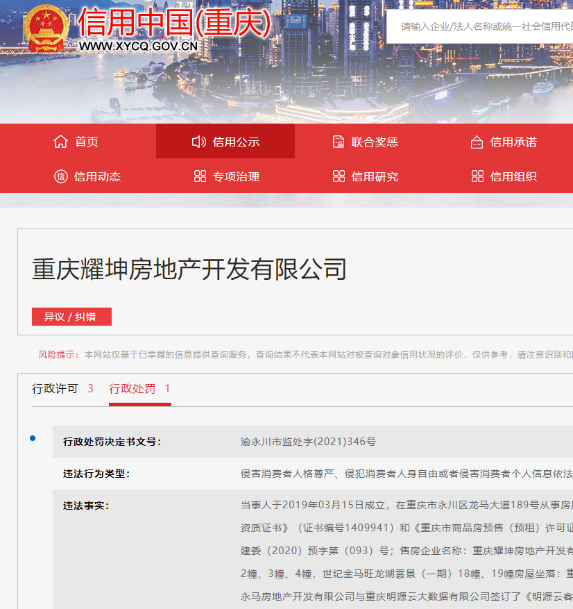 耀坤地产的行为涉嫌侵害消费者人格尊严、侵犯消费者人身自由或者侵害消费者个人信息依法得到保护的权利,重庆市永川区市场监督管理局对其作出罚款5万元,并责令消除影响的处罚。