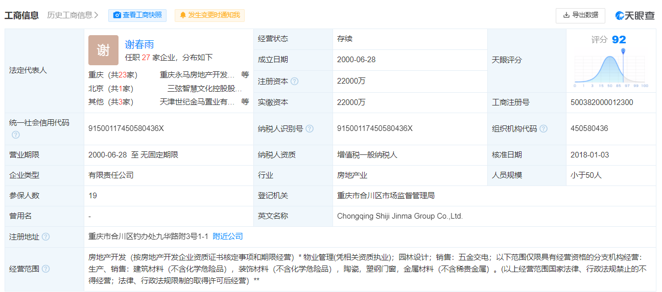 天眼查APP显示,耀坤地产和重庆永马均为重庆世纪金马实业(集团)有限公司(以下简称“世纪金马”)旗下公司。其中,世纪金马对耀坤地产持股80%,对重庆永马持股70%。