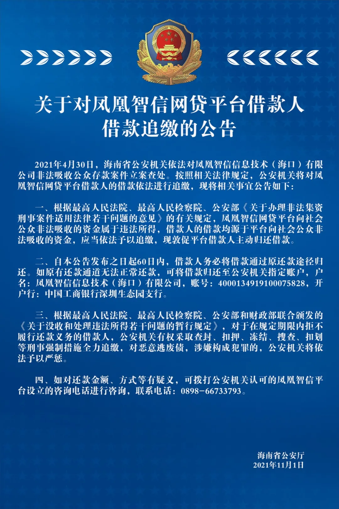 “海南警方”微信公众号消息,2021年4月30日,海南省公安机关依法对凤凰智信信息技术(海口)有限公司非法吸收公众存款案件立案查处。按照相关法律规定,公安机关将对凤凰智信网贷平台借款人的借款依法进行追缴,现将相关事宜公告如下: