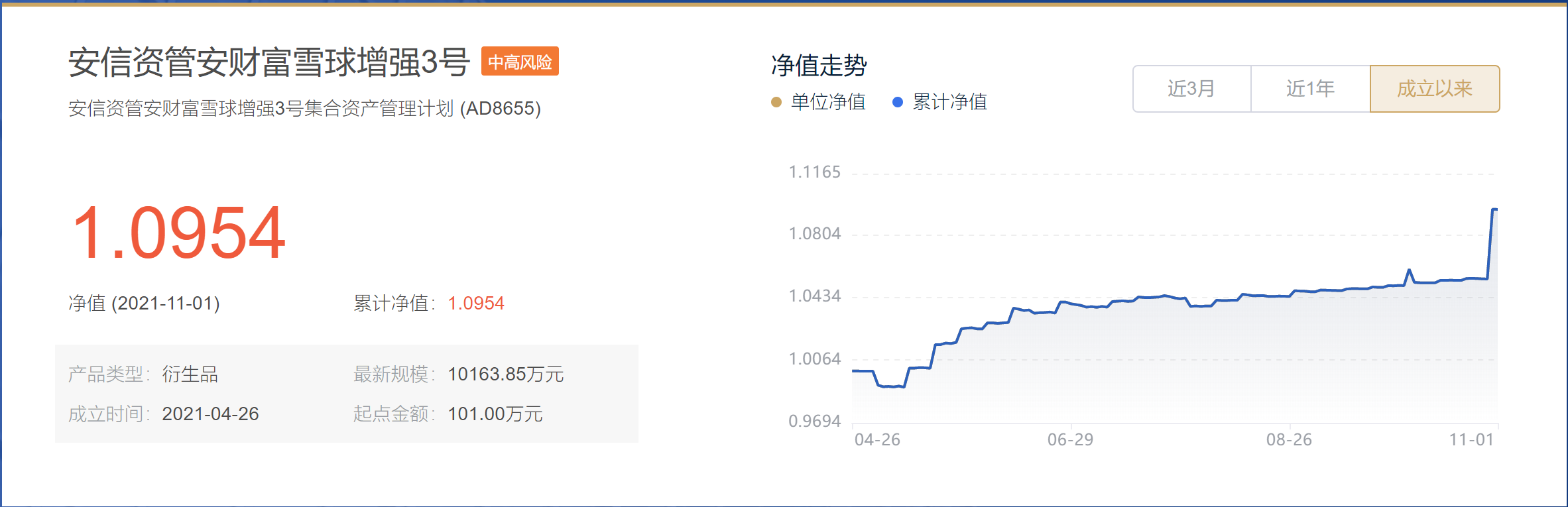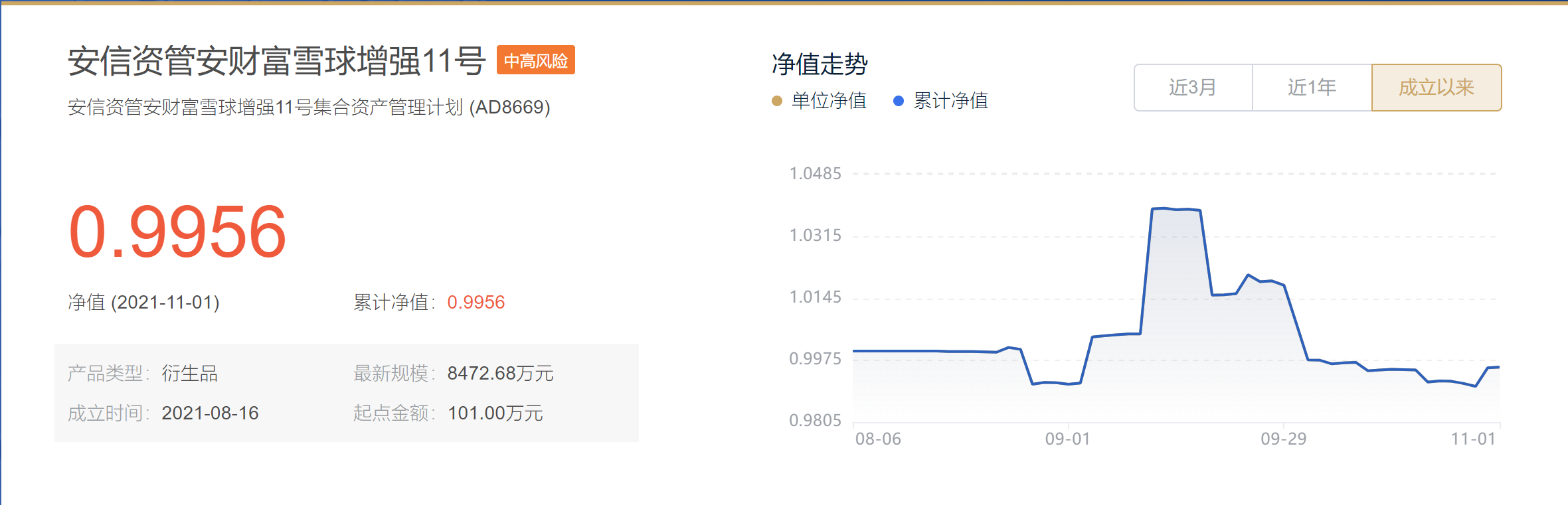 相比之下,8月份成立的安信资管安财富雪球增强11号就没那么幸运,该产品成立后走势较为动荡,9月中旬最高净值1.0393元,10月破净后始终在1元以下,最低净值0.9903元。